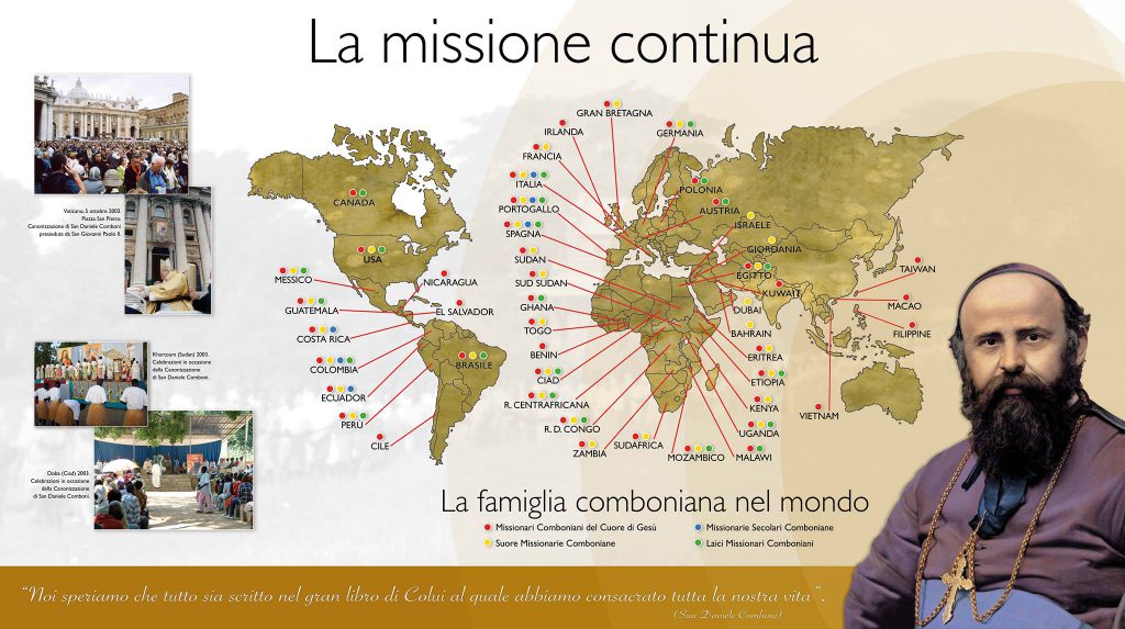 L’opera di Daniele vide nascere gli Istituti religiosi delle Suore e dei Missionari Comboniani e in tempi più recenti le Missionarie Secolari Comboniane e le Laiche e i Laici Missionari Comboniani. Cosicché, l’anelito “Se avessi mille vite, tutte le darei per la missione” ha continuato a declinarsi nel tempo, nelle vite di chi ha scelto di continuare il Piano, di tradurlo nel cammino di una famiglia, la Famiglia Comboniana.